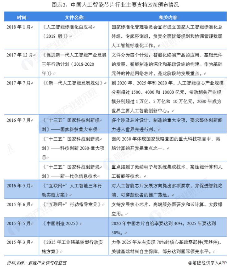 近几年国家高度关注人工智能芯片产业的发展,相继发布一系列产业支持政策。2017年7月提出的《新一代人工智能发展规划》分别制定2020年、2025年、2030年三阶段的战略目标,其中,第一阶段的《促进新一代人工智能产业发展三年行动计划(2018-2020年)》,将重点扶持神经网络芯片,希望人工智能芯片在国内实现量产且规模化应用。